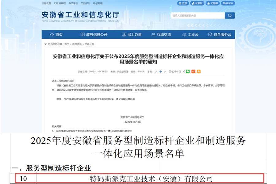 安徽省工业和信息化厅公布了2025年度服务型制造标杆企业和制造服务一体化应用场景名单,中感・特码斯派克成为淮南市本年度唯一获此殊荣企业。