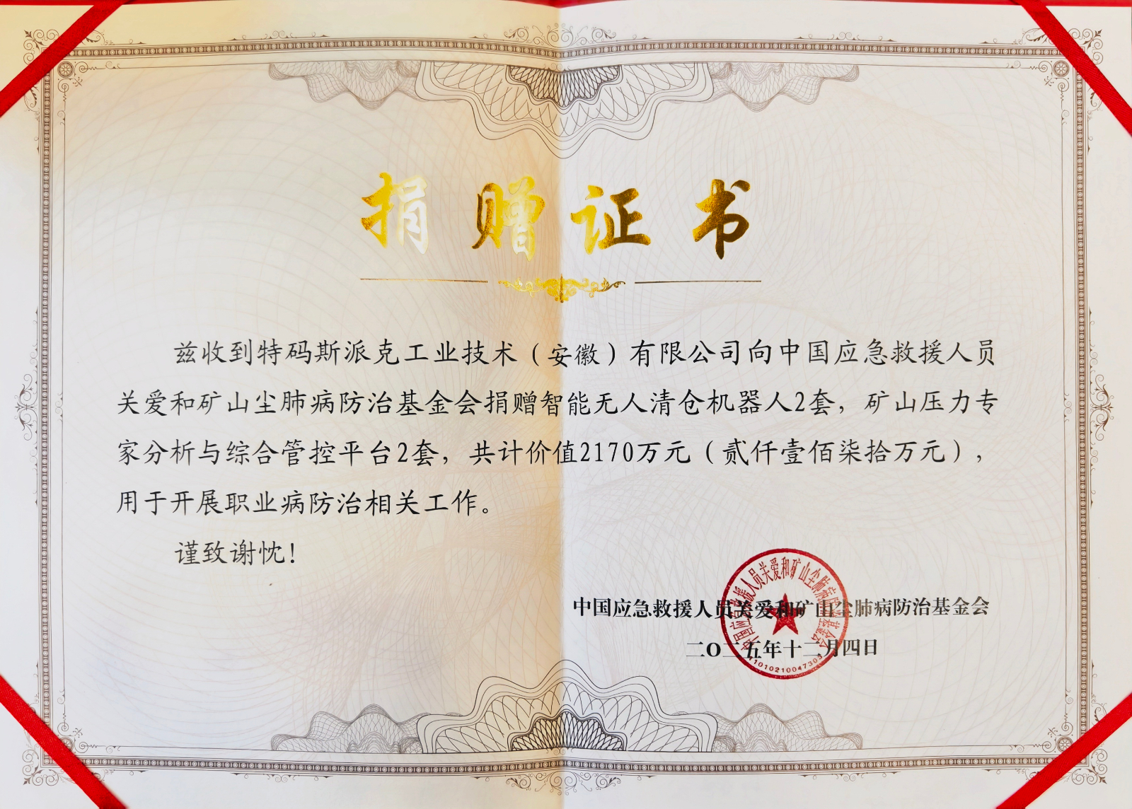 向中国应急救援人员关爱和矿山尘肺病防治基金会捐赠价值超两千万智能装备,并达成深度战略合作,建立了支持应急救援与职业健康事业的长期纽带。