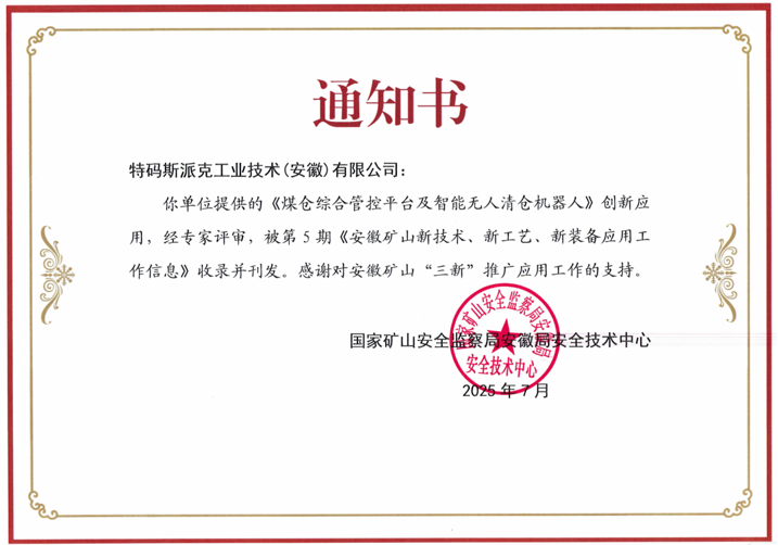 公司创新研发的“煤仓综合管控平台和智能清仓机器人”获安徽省“矿山新技术、新工艺、新装备”三新成果认定。