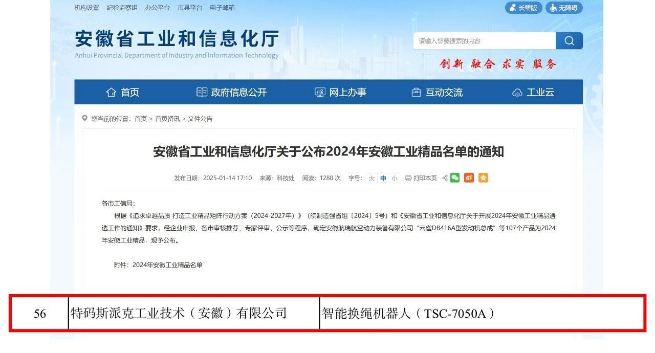 公司入选安徽省“2024年安徽工业精品认定名单”