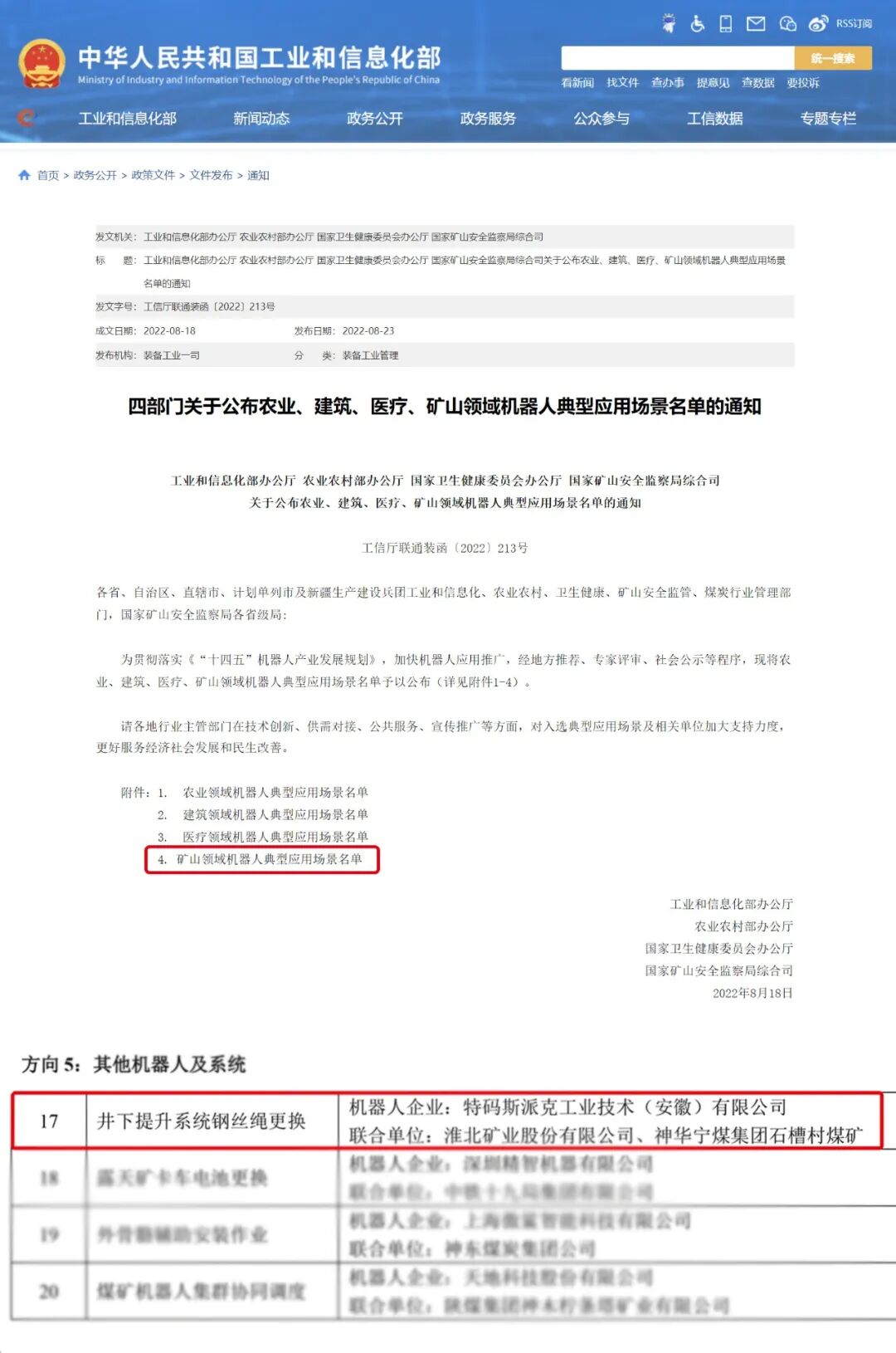 特码斯派克自主研发的《井下提升系统钢丝绳更换》入选“矿山领域机器人典型应用场景”,是机器人及系统方向换绳行业内唯一入选的企业,打造行业新标杆。