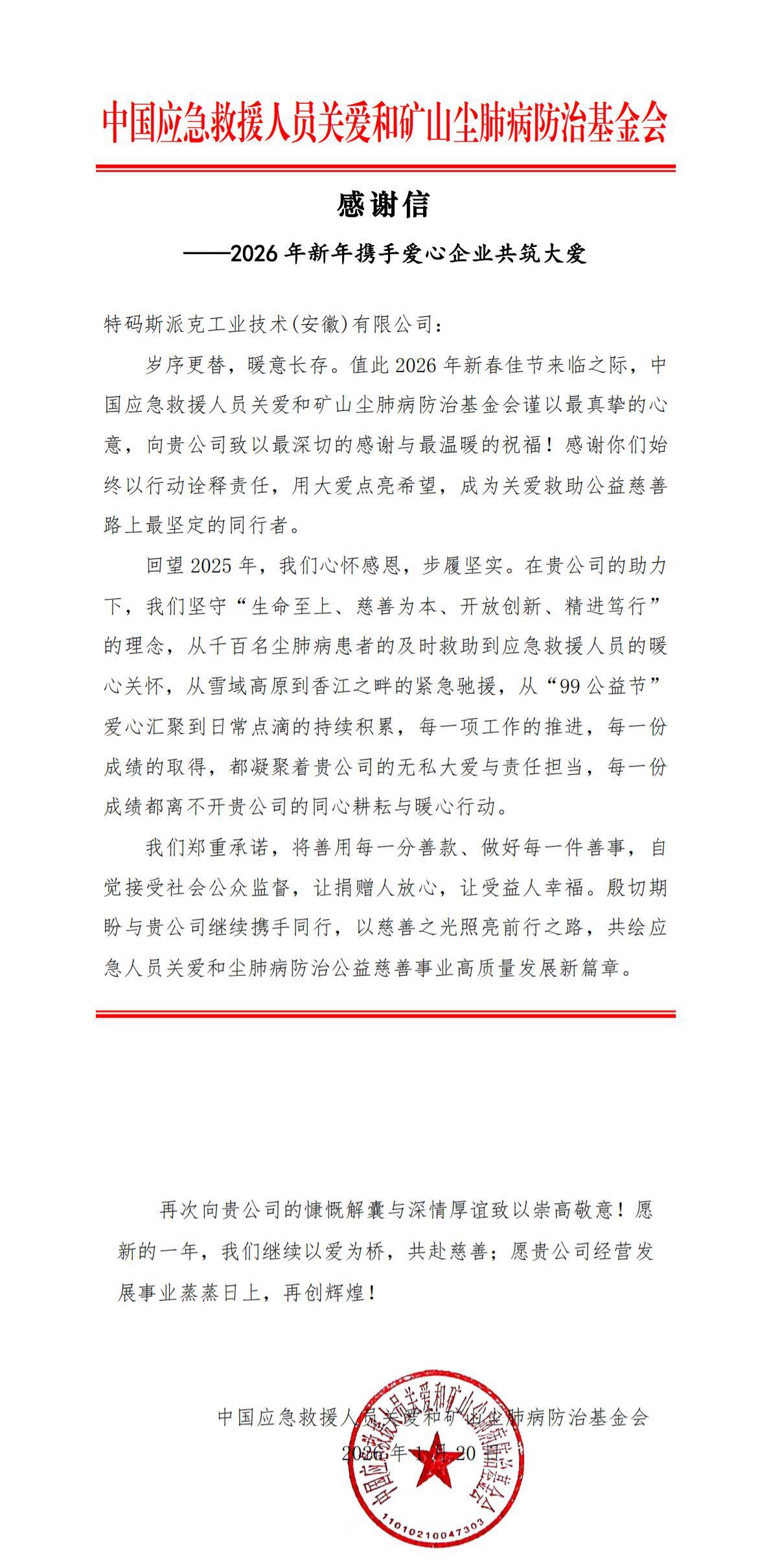 基金会在感谢信中表示:“在贵公司的支持下,我们得以更好地贯彻‘生命至上、慈善为本’的宗旨,从尘肺病患者的及时救助到应急救援人员的系统关怀,各项工作均取得扎实进展。”这一评价充分体现了企业捐赠行为与基金会使命的深度契合。